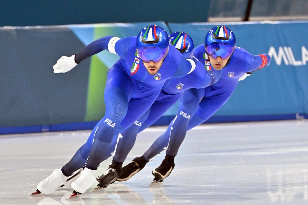 La Nazionale di speed skating pattina nuovamente nell’oro ai Giochi Olimpici di Milano Cortina 2026. Dopo lo storico doppio trionfo individuale targato Francesca Lollobrigida (3.000 metri e 5.000 metri), infatti, l’anello di ghiaccio del Milano Ice Park ha fatto da cornice alla memorabile impresa del terzetto composto da Davide Ghiotto, Andrea Giovannini e Michele Malfatti (foto Ferdinando Mezzelani/CONI), che ha conquistato il successo nell’inseguimento a squadre maschile. Una vittoria che per l’Italia nell'ambito olimpico mancava all’appello addirittura da 20 anni, quando Enrico Fabris, Ippolito Sanfratello, Matteo Anesi e Stefano Donagrandi alzarono le braccia al cielo in occasione dell’ultima edizione casalinga di Torino 2006. Si tratta della 24ª medaglia (nove ori, quattro argenti ed 11 bronzi) per l’Italia Team a Milano Cortina.