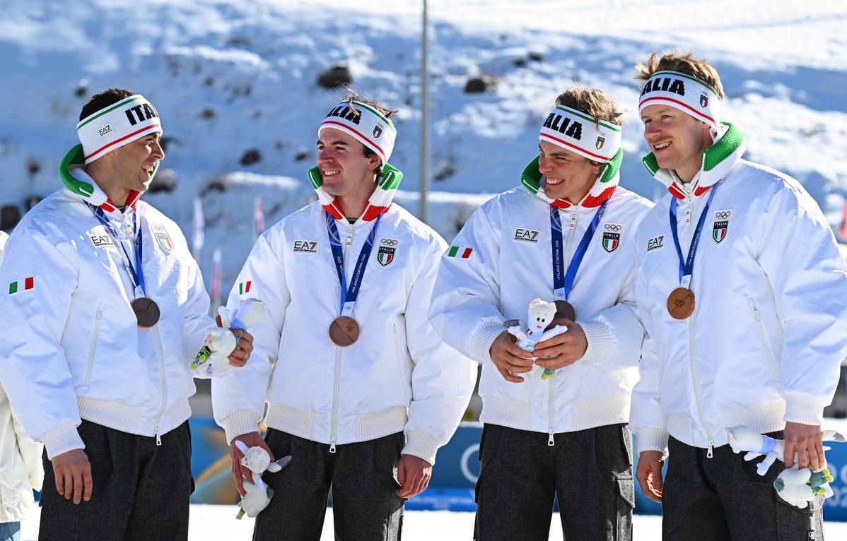 L’Italia maschile si assicura nuovamente un posto sul podio olimpico nella staffetta. A Lago di Tesero, in Val di Fiemme, il quartetto composto (in ordine di apparizione) da Davide Graz (tecnica classica), Elia Barp (tecnica classica), Martino Carollo (tecnica libera) e Federico Pellegrino (tecnica libera) si è fregiato del bronzo sulla nuova distanza dei 4x7.5 km (TC/TL). È la sesta medaglia azzurra a squadre della storia per gli uomini (foto Gianpalo Piazzi/CONI), tornati nella top-3 a cinque cerchi di specialità a ben 20 anni di distanza dall'ultima volta, dopo due ori (Lillehammer 1994-Torino 2006) e tre argenti (Albertville 1992-Nagano 1998-Salt Lake City 2002). In tutti e cinque i casi si gareggiò nel format più lungo della 4x10 km.